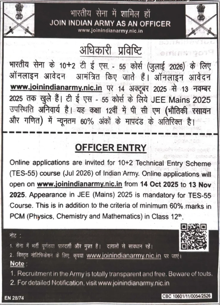 Join Indian Army, has started the joinindianarmy.nic.in Army 10+2 TES 55 Recruitment 2025 from 14 October 2025 for Army 10+2 TES 55 Bharti 2025. Follow these steps for Army 10+2 Technical Entry TES July 2026 Batch Scheme TES 54 Entry Post Online Registartion Application Form 2025 Link.